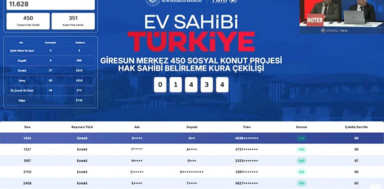 500 bin konut kampanyasında 450 daire ayrılan Giresun Merkez TOKİ projesi için 11 bin 628 başvuru arasından kura sonuçları isim isim açıklandı.