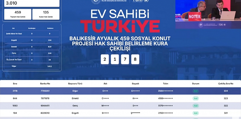 Balıkesir Ayvalık TOKİ 459 konut kura sonuçları açıklandı! 3.010 başvuru arasından hak sahipleri noter huzurunda belirlendi.