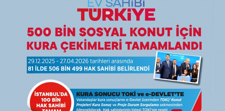 Çevre, Şehircilik ve İklim Değişikliği Bakanı Murat Kurum, Ev Sahibi Türkiye kampanyası dahilinde 500 bin sosyal konut kura çekilişlerinin son ili olan İstanbul'da 100 bin sosyal konut kura çekilişinin tamamlandığını duyurdu.