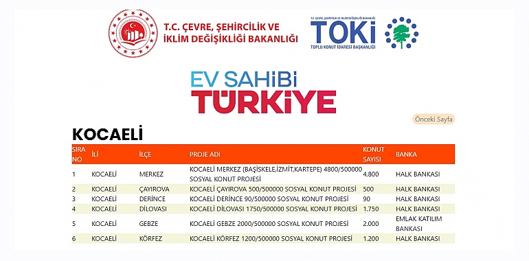 | 1 | KOCAELİ | MERKEZ | KOCAELİ MERKEZ (BAŞİSKELE,İZMİT,KARTEPE) 4800/500000 SOSYAL KONUT PROJESİ | 4.800 | HALK BANKASI |
